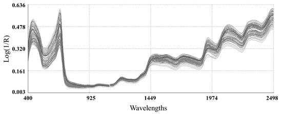 Raw spectra of the calibration set samples are shown in Figure 5. A remarkable variability in the VIS region (400–850 nm) absorbance spectra was observed because of pigments. The peak around 640–700 nm illustrated the color transition of pea pods correlated with the chlorophyll content that absorbs radiation in this region [72].