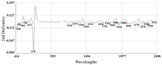 Second derivative spectra (2, 5, 5, 2; SNV + DT) of the raw optical data for mangetout samples in the range of 400 to 2500 nm, together with the most relevant absorption bands.