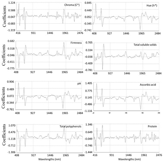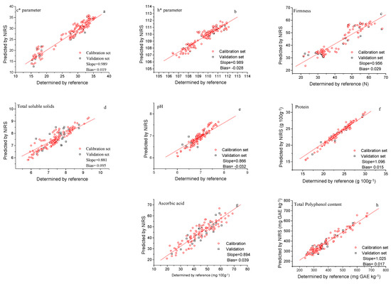 Based on the R2 values of the external validation, the models were as follows [39]: models that can be used to discriminate between low and high values of the samples (0.50 m< R2 < 0.64), in our work the models developed for AAC and TSS; models that can be used for rough predictions of samples (0.65 < R2 < 0.81), in our case the calibrations achieved for C* and h* color parameters, firmness and pH; and models with good correlations (0.83 < R2 < 0.90), these values corresponding with models obtained for total polyphenol content and protein.