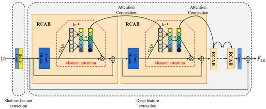 where and are learnable parameters. For the first residual channel attention block in the deep feature extraction part, (, ) is set to (1, 0); then, Equation (7) is simplified to Equation (6). is the attention map produced by the previous attention block. Finally, S is used to rescale F:
