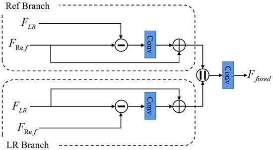Our DPFM consists of two branches: the Ref branch and the LR branch. Such a design allows the network to further refine the information that differ from each other. Taking the Ref branch as an example, we first compute the residual between and the LR features , then apply a convolutional layer with kernel size of 3 to the residual and add it back to the to obtain a more discriminative feature representation :