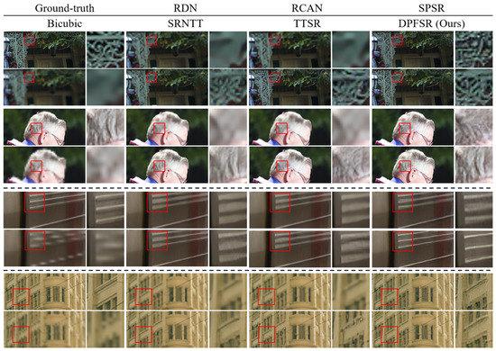 In addition, we also considered the comparison with other patch-based RefSR methods in the number of network parameters and execution time. We took five pairs of images as input to calculate the average execution time, where each pair contains a 120 × 120 LR image and a 400 × 400 Ref image, respectively. As described in Table 6, it can be found that TTSR and DPFSR are significantly faster than SRNTT in terms of execution time. Combining the results in Table 5, we can conclude that DPFSR achieves the best performance on PSNR and SSIM, although it is slightly inferior to TTSR in terms of the number of network parameters and execution time.