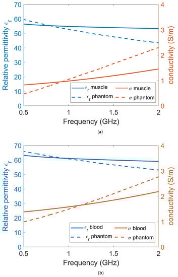 The experiments and simulations were performed in a simplified environment consisting of only two tissues: muscle and blood. Muscle tissue was used to model the leg of a patient and blood was used to model the bleeding caused by a muscle rupture. Other tissues in the leg, such as bone, fat and skin, were omitted for simplicity. This simplified scenario should still be sufficient to show the proof of principle for the use of a lossy gel to mitigate the effects of multipath signals. Dielectric data for muscle tissue and blood tissue were obtained from [20] and are shown in Figure 1. For the experiments, muscle and blood phantoms were manufactured using water as a solvent, salt to control the conductivity, sugar to control the permittivity and agar to solidify the phantom [52]. The goal was to manufacture phantoms with properties that were as close as possible to published dielectric tissue data. However, with these substances, it was not possible to accurately mimic the dispersive behavior of real tissue over a wide frequency band. There are many other different substances with which to fabricate tissue-mimicking phantoms, such as oil in gelatin mixtures [53] and Triton X-100-based liquid mixtures [54], but these also come with the problem of inaccurately mimicking dispersive behavior compared to the tissue data. We decided to use water, salt and sugar because the manufacturing process is simple, the ingredients are harmless and the dielectric properties are good enough for a proof of concept. The permittivities and conductivities of the phantom and gel materials were measured using SPEAG’s Dielectric Assessment Kit (DAK). The dielectric properties used in the simulations were the same as the measured dielectric properties of the phantom material.