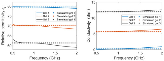 The relative permittivity and conductivity of the three lossy gels. The measured data of the gels, as well as the corresponding properties that were used in the simulations, are shown.