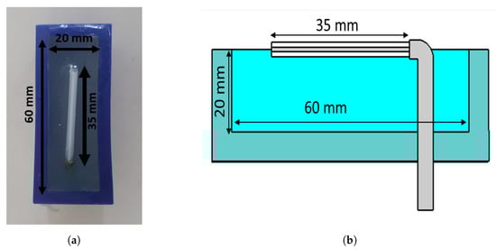 The antennae that we proposed for the muscle rupture detection application are shown in Figure 3a,b. The monopole antennae were manufactured by peeling off the outer conductor from a semirigid coaxial cable. The resulting radiating element had a length of 35 . The monopole was bent , such that it could be mounted through a hole in the back of the plastic container, as seen in Figure 3b. The plastic containers had inner dimensions of 20 × 60 mm. The thickness of the plastic wall was 5 mm. The figure also shows the gel present inside the container. During the measurements, the antennae were applied in direct contact with the surface of the muscle phantom, such that the monopole elements were also in direct contact with the phantom. For the sake of maximizing the transmission into the leg, we did not want any lossy gel between the antenna and the skin, only behind and beside the skin to attenuate the outgoing multipath signals.