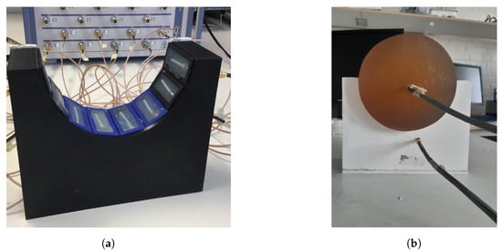 Figure 4a shows the measurement system with the eight transmitting/receiving antennae. The antennae were mounted in a semicircular array with a 16-cm diameter and an angular spacing of between the individual antennae. The antennae were connected to a Rohde & Schwarz ZNBT8 16-channel vector network analyzer via flexible coaxial cables. This VNA has a dynamic range of up to 140 dB and operates within the frequency range of 9 to 8.5 , even though we only measured within the range of 0.5 to 2.0 . The measurements were taken using each antenna as a transmitter while the remaining antennae acted as receivers. In Figure 4b, the muscle phantom can be seen inside the antenna array. The phantom was slightly smaller than the array, with a diameter of 15.6 .