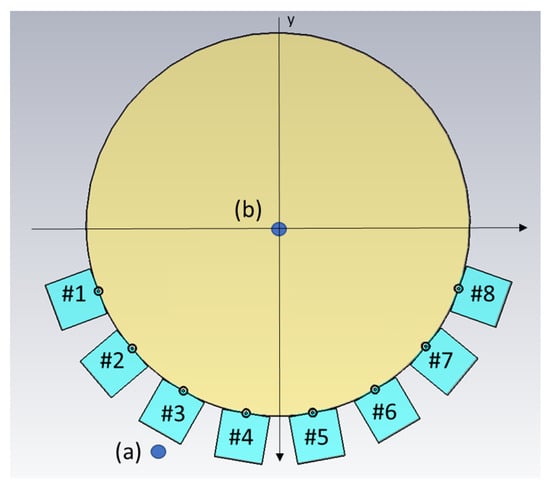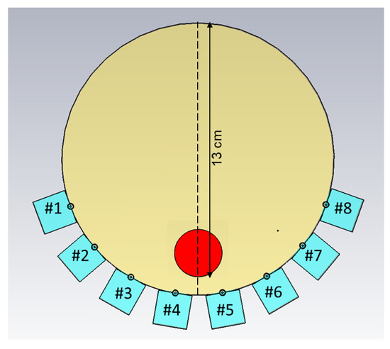 Simulations corresponding to the field probe measurements were performed. The simulations were carried out in 3D and a cross-sectional image of the model is shown in Figure 5. In this figure, the muscle phantom is represented by a cylinder with a 16-cm diameter and the eight antennae, numbered #1–#8, are shown at the bottom of the image. The monopoles are shown as circles touching the muscle phantom and behind them are the quadratic-shaped gels. The plastic material of the containers was not included in this model. The dielectric properties of the simulated Gel #1, Gel #2 and Gel #3 are shown in Figure 2. The monopole antennae had the same dimensions as those in the measurements. The simulations were performed using the CST Studio Suite, Release Version 2020.07, in the frequency range of 0.5–3 . In the same way as in the previous experiments, the simulations were performed using the two field probe antennae: one placed in the center of the phantom (a) and one placed just behind Antenna #3 (b).