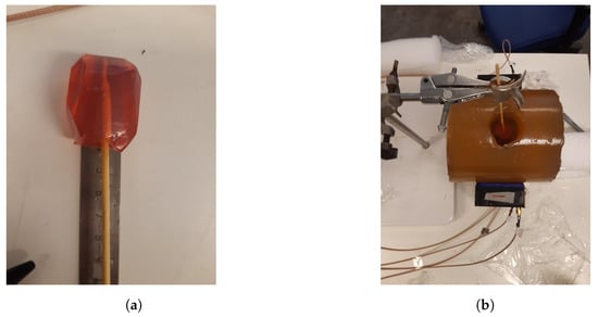 Another set of experiments was carried out for the purpose of image reconstruction. For this, a hole was carved into the muscle phantom to allow for the insertion of a blood phantom. The hole went 13 cm deep from the top of the phantom, as sketched in Figure 6. This hole was filled with a liquid muscle phantom of the same properties as the solid muscle phantom. This hole made it easy to make a priori measurements without the blood phantom being present. The blood phantom had a diameter of 4 and is shown in Figure 7a. Figure 7b shows the hole through which the blood phantom was inserted into the muscle phantom. A wooden stick was attached to the muscle phantom to facilitate the insertion and extraction of the blood phantom. The measurements were taken with and without the blood phantom present.