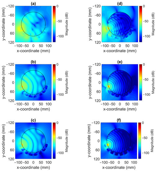 The magnitude of the electric field distribution was investigated using the simulation model shown in Figure 5 but without the field probes present. To elaborate, the cross-sectional images of the field patterns are shown for the frequencies of 0.7 and 1.65 in Figure 8. Antenna #1 was acting as transmitter. These images illustrate that it was possible to decrease the magnitude of the waves propagating outside the muscle phantom and around the antennae with a more lossy gel. For the lowest conductivity cases for Gel #1, as shown in Figure 8a,d, the wave patterns inside the phantom were rather chaotic and the field amplitudes outside the phantom were prominent. This effect was especially evident for the 0.7 case. With increasing conductivity in the gel for Gel #2, as shown in Figure 8b,e, and the even higher conductivity in Gel #3, as shown in Figure 8c,f, it was seen that the field strengths outside the muscle phantom decreased and the wave fronts inside the phantom became more regularly shaped as semicircular wave fronts. We interpreted these results as meaning that the lossy gels helped to attenuate the multipath signals outside of the muscle phantom model. With weaker field strengths outside the muscle phantom, weaker fields were also coupled back into the phantom from directions other than the transmitting antenna itself and, therefore, less interference with the straight path propagation from the transmitting antenna occurred inside of the model. The effects of the multipath signal propagation were more apparent at 0.7 than at 1.65 due to the higher attenuation at higher frequencies.