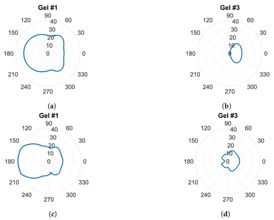 Traditional radiation diagrams are not relevant to illustrate the directional properties of the antennae as they show far-field characteristics, so to further illustrate the damping effect of the gels, something similar to a radiation diagram was generated. The simulations were carried out as above at frequencies of 0.7 and 1.65 , but with only one transmitting antenna present and the other seven antennae removed. The magnitude of the electric field was sampled on a circle that was centered in the monopole element and had a radius of one wavelength () at the corresponding frequency. This field was then plotted in the radial diagram in Figure 9. The geometry was such that the plot corresponded to the H-plane of a radiation pattern and the angular coordinate was oriented so that in the plot was pointing in the same direction as the surface normal of the antenna at the antenna–phantom interface. For Gel#1 (Figure 9a,c), the field strengths behind the antennae were even higher than those in the muscle tissue in front of the antenna. Figure 9b,d show that for Gel #3, the E-field behind the antennae was significantly lower than that for Gel #1. In front of the antenna, the field was stronger; in fact, it was almost the same amplitude as for Gel # 1. This verified that the lossy Gel #3 effectively attenuated the waves traveling backward and sideways from the antenna.