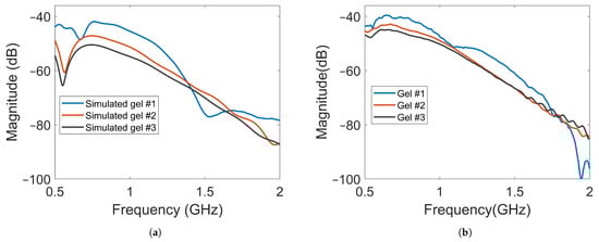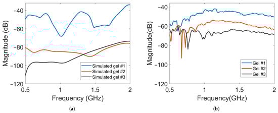 Magnitude of transmission coefficients between the transmitting antenna and Probe B for Gel #1, Gel #2 and Gel #3: (a) simulated transmission coefficients; (b) experimental transmission coefficients.