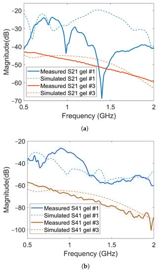 As shown in Figure 12, there were significant differences between the simulated and experimental data for Gel #1. Gel #1 had a low conductivity and, therefore, did not dampen the backward waves effectively. As a result, significant levels of multipath signals around the system that interfered with each other could be expected. The measured S-parameters, therefore, became quite unpredictable as even small changes in the experimental setup could lead to large fluctuations in the measured signals, making it difficult to obtain a good agreement between experimental and simulation data. To some extent, this also illustrated the importance of using a lossy gel, which reduced the levels of multipath signals and made the measurements more predictable. With Gel #3, the multipath signals were attenuated to a much larger degree, resulting in a better agreement between the measurement and simulation results.