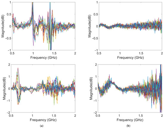 Differences between the object and baseline for 15 measurements: (a) results using Gel #1; (b) results using Gel #3. The upper images show the results for S21 and the lower images show the results for S41.