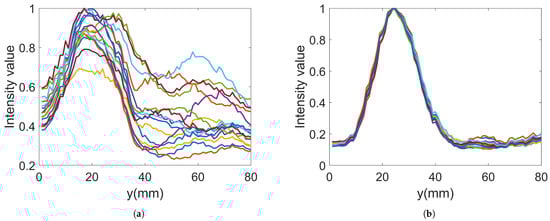 Reconstructed data along the line through the center of the imaging domain for 15 images: (a) Gel #1; (b) Gel #3.