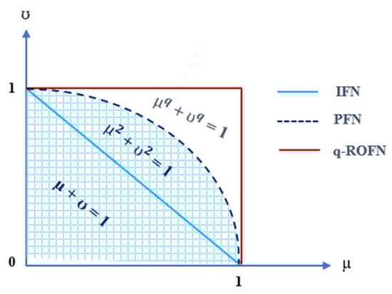 Yager presented q-ROFSs in 2018 with the grade of membership and non-membership. In q-ROFSs, the total of the qth power of the membership and non-membership grades should be at most equal to 1 [18]. In Figure 2, it is readily noted that q-ROFSs have a reasonable membership degree extent greater than that of the IFSs and PFSs. q-ROFSs are explained as stated in Definition 5.