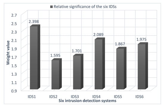 Step 18. The evaluation values () of the alternatives are identified by applying Equation (35). Then, the six intrusion-detection systems are rated according to the most possible value of the evaluation values (), as presented in Table 16 and in Figure 6.