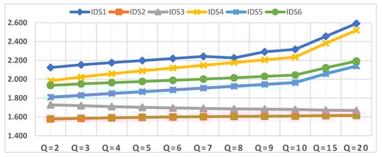 The first scenario is the effect of a change in parameter q on the evaluation of IDSs. Accordingly, the value of the parameter q was changed several times, from q = 2 to q = 20, to show its impact on the evaluation of IDSs, as presented in Figure 8. Although the value of the q parameter has been changed several times, the order of the IDSs has not changed at all. remains the best alternative throughout the sensitivity analysis and parameter value change q, followed by . By contrast, remains the lowest in order despite the change in the value of the parameter q. The changes that can be observed based on the change in the value of the parameter q in the order of the IDSs, show there is a large convergence between the values of the assessment of and at the value of q = 2. Significant convergence occurs between the and assessment values at q = 8; otherwise, the order of the IDSs remains the same despite the presence of some increases in the weights of the IDSs.