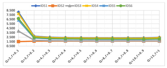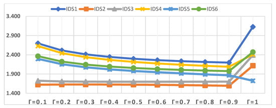 The second scenario is the effect of a change in parameter γ on the evaluation of IDSs. Accordingly, the value of the parameter γ was changed several times, from γ = 0.1 to γ = 1.0, to show its effect on the evaluation of IDSs, as shown in Figure 9. Although the value of the parameter γ was changed several times, the order of the IDSs changed only when the value of parameter γ = 1.0. remains the best alternative throughout the sensitivity analysis and parameter value change γ = 0.1 to γ = 0.9 followed by , except when parameter value γ = 1.0, then becomes the second rank in the analysis process. In contrast, remains lowest in order throughout the change of the value of the parameter γ = 0.0 to γ = 0.9, except when the value of γ = 1.0 is changed, then becomes the fifth rank, penultimate. The changes that can be observed based on the change in the value of the parameter q in the order of IDSs, is that when the value of the parameter γ = 1.0, the order of the IDSs changes so that is in the first order, while is in the second order, and is in the third order. On the contrary, the rank of some IDSs was changed, such as the rank of and the , which became the fifth and sixth, respectively.