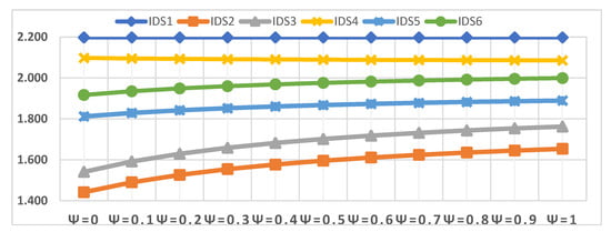 The fourth scenario is the effect of a change in parameter Ѱ on the evaluation of IDSs. Accordingly, the value of parameter Ѱ was changed several times from Ѱ = 0.1 to Ѱ = 1.0, to show its effect on the evaluation of the IDSs, as shown in Figure 11. Although the value of parameter Ѱ was changed several times, the order of the IDSs did not change at all. remains the best alternative throughout the sensitivity analysis and parameter value change Ѱ = 0.1 to Ѱ = 0.9, followed by . On the contrary, remains in the lowest order by changing the parameter value Ѱ = 0.1 to Ѱ = 1.0.