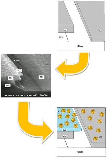The stages of modification of the blade-type planar structure may be presented schematically as in Figure 1. Initially, the emitter was developed on the basis of a pure molybdenum blade having a submicron thickness (the design is shown in Figure 1, upper fragment). The transformation of a molybdenum blade into a composite one due to the formation of a thin nanosized diamond-like carbon (DLC) film on its surface (see Figure 1, middle fragment) was aimed primarily at stabilizing the field emission density. Such a planar structure with a composite “Mo-DLC” blade, as was theoretically justified and experimentally confirmed in [25], has a number of attractive properties, including the following: