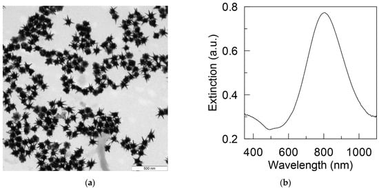 The synthesized GNSs (see TEM image in Figure 2a) have a plasmon resonance at 800 nm and an extinction of 3.86 cm−1 (see Figure 2b) when suspended in water. This experimental extinction spectrum was used in the construction and tuning of the computational model. To solve the wave equation, the COMSOL software package [31] was used. At all interfaces of regions made of dissimilar materials (GNSs and surrounding water), the boundary conditions of continuity of the tangential components of the strength and the normal components of the induction of the electric and magnetic fields were satisfied. External surfaces modeling the transition to free space were constrained by PML«perfectly matched layers» [31,32].
