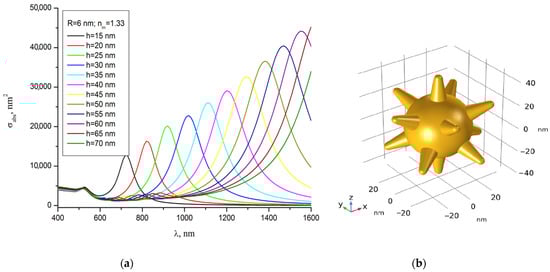 Calculated absorption cross-section spectra depending on the length h of the tips of GNS in water: the GNS is irradiated with laser light linearly polarized along the axis of one of the tips (a). Determined geometric model of the GNS: the core diameter is 50 nm, the length h of the conical tips is 19 nm, the diameter of the base of the tips is 12 nm, the radius of the tip end is 3 nm, the number of tips is 12 (b).