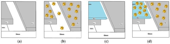 To conduct an experimental analysis of the effectiveness of using GNSs to stimulate the tunneling emission of an electron current source, samples of planar blade structures of the following four modifications were fabricated: with a molybdenum emitter blade (marked “Mo”, shown in Figure 4a); with a molybdenum blade and GNS coating (“Mo-GNS”, shown in Figure 4b); composite blade with DLC film (“Mo-DLC”, shown in Figure 4c); with a hybrid blade with DLC film and GNS coating (“Mo-DLC-GNS”, shown in Figure 4d).