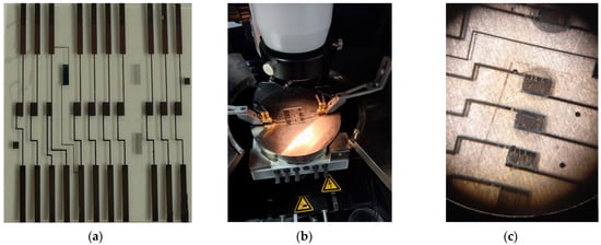 All samples had the same electrode topology and emission structure (shown in Figure 5a). I–V measurements were carried out on an Agilent B1500A Semiconductor Device Analyzer, USA (see Figure 5b), which provides precise positioning and reliable contact of the power supply circuit elements with the switching strips of the breadboards, as shown in Figure 5c for the sample of the “Mo-DLC-GNS” structure.
