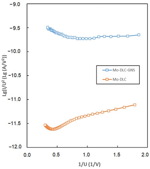 The main significant result of the conducted studies of the I–V characteristics was the establishment of the pattern of a significant increase in the field emission current of the structures of the “Mo-DLC-GNS” type in comparison with the emissivity of the structures of the “Mo-DLC” type. This follows from a comparison of the curves plotted in the Fowler–Nordheim coordinates in Figure 6.