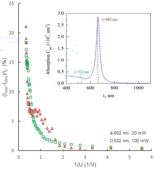 Dependence of the photocurrent, normalized to the value of the maximum dark current I0, with a change in the value 1/U: square markers correspond to red laser irradiation (λ = 662 nm, laser power P662 of 20 mW, triangular markers correspond to green laser irradiation (λ = 532 nm, laser power P532 of 100 mW. The inset shows the absorption spectrum of GNPs in air, where the wavelengths of the used lasers are shown.