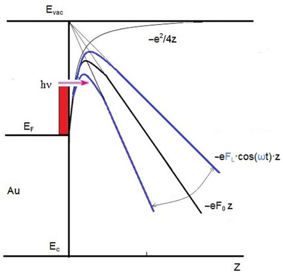 It is known that the main limitation of generating a significant photoinduced current is the unacceptably high heating of the emitter as the intensity of the laser beam increases. Therefore, the use of pulsed laser radiation in the mode of short pulses instead of CW can become a universal recipe for realizing the possibility of deep optical modulation of the laser-induced electron current. Figure 8 schematically illustrates the periodic change in the profile of the potential barrier under the simultaneous influence of strong electrostatic (intensity F0) and optical (amplitude FL) fields. The change in the width and height of the potential barrier with the frequency of optical vibrations ω has a significant effect on the permeability of the barrier, determining the magnitude of field and photoemission.