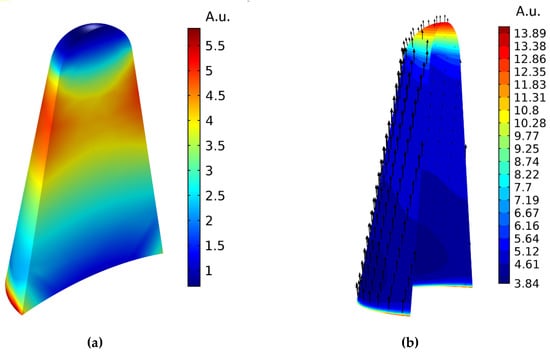 At the same time, the spatial distribution of thermal sources photoinduced in the GNS is essentially spatially inhomogeneous, being localized mainly in the tips [15], where pronounced regions of absorption localization are also observed. The latter is clearly demonstrated in Figure 9. The finite element model described in [15] was used, the dimensional parameters of the GNS were determined in Section 2, the calculation for the complete system considering the air environment was carried out in the COMSOL environment [31], and the distribution topograms are given for the tip with maximum absorption.