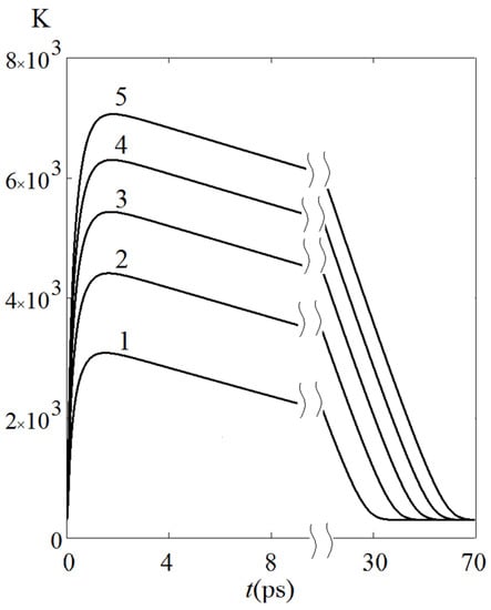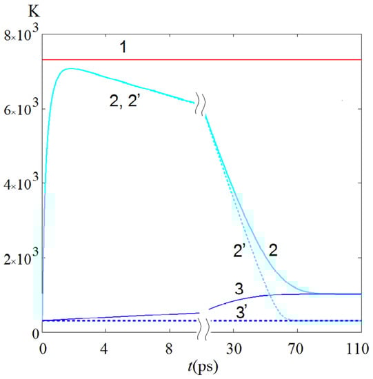 Figure 13 compares the results of the following calculations: in model 1, a two-temperature model that neglects the kinetics of the hot electron density N(t); (substitution in Equation (1) dN/dt = 0); in model 2, based directly on Equation (1), which explicitly takes into account the kinetics of N(t).