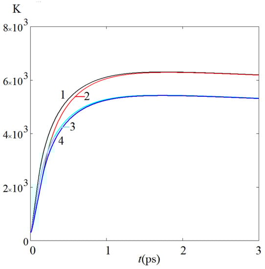 Kinetics of electron temperature for the following parameters: curve 1—power density of irradiating light PS = 200 MW/cm2 and pulse duration tp = 100 fs; curve 2—100 MW/cm2 and 200 fs; curve 3—150 MW/cm2 and 100 fs; curve 4—100 MW/cm2 and 150 fs, respectively. The calculations correspond to the isothermal boundary condition with the same other parameters.