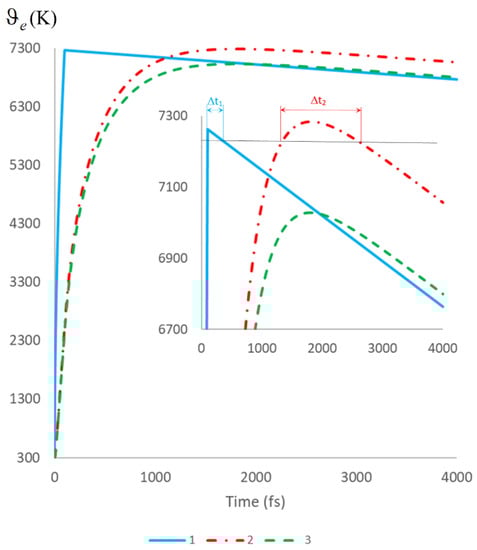 - At the same value of the electron temperature maxima , the time interval during which the electron temperature retains high values is approximately three times higher than this value for the two-temperature model as follows: (see inset in Figure 13).