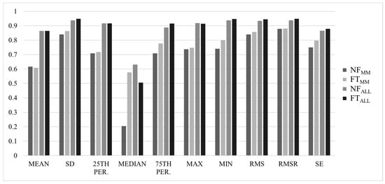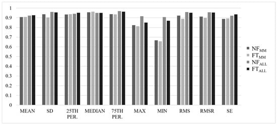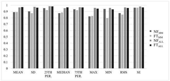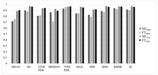 The results from the NF state are consistent with previous findings on the reliability of the acceleration RMS signal, which have reported ICC values of 0.89–0.98, 0.95–0.97, 0.97, and 0.90–0.99 for the RMSVT, RMSML, RMSAP, and RMSRES, respectively [,]. These values align with our findings, where ICC values using the ALL method were 0.97, 0.93, 0.96, and 0.97 for RMSVT, RMSML, RMSAP, and RMSRES, respectively. However, the values from the previous studies and the ALL method were somewhat higher than those of the MM method (RMSVT = 0.89, RMSML = 0.84, RMSAP = 0.92, RMSRES = 0.88). To our knowledge, no other accelerometer-derived statistical features have been previously analyzed for reliability, so it is not possible to compare other features to previous results.