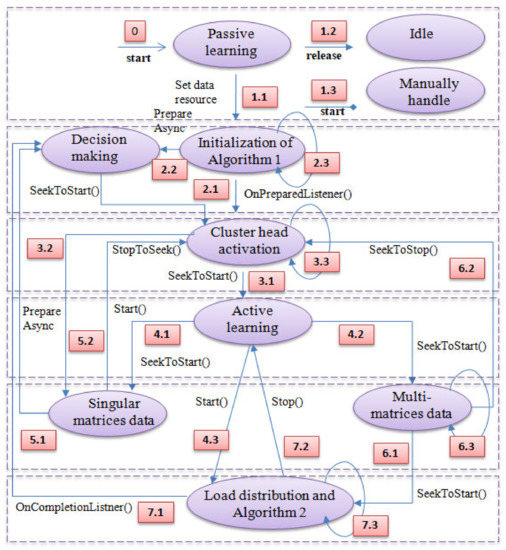 Two kinds of task handling have been conducted in the proposed cooperative model. While there is no manual or automated load triggering, the system continuously performs passive learning; after a manual or automatic load triggers the IoV module, it shifts to the active-learning procedure. The node itself acts as a decision-making module for a singular matrix handle related to image processing, audio processing, or sensor data handling by individual intelligent edges [8,14]. For passive-learning conditions (mentioned in Algorithms) cluster heads act as decision-making units to decide which information should be shared within the cluster and which data could be published among the other cluster heads of a more extensive IoV network. The cluster head also distributes the load by choosing the appropriate data handler and allocating the computational task.