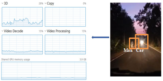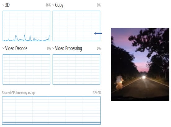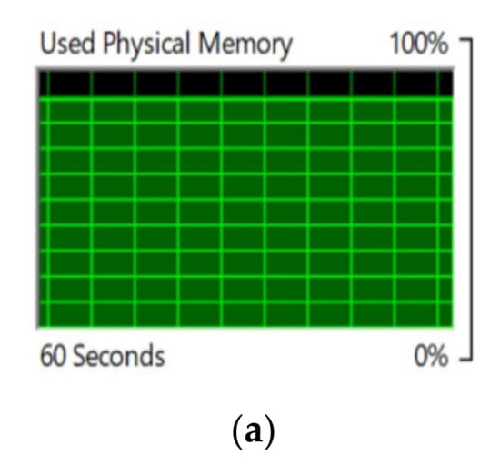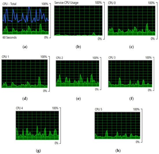 Figure 6 depicts the overall/shared processing effort towards audio–visual data processing. The utilization increased from 16% to 28%, while processing the video data. Shared memory utilization also increased by 3.08%.