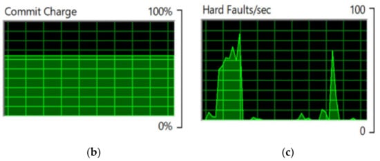 We entered seven intelligent edges into our prototype IoV model for the single IoV node. Then, we assigned one edge as the cluster head and connected the other six edges to that cluster head. Figure 7a shows the overall processor utilization for video-data processing by the cooperative-based learning approach. Figure 7b shows the service processor utilization of mother edge or the data-receiving end, whereas Figure 7c–h show the utilization of edge devices for video-data processing by the cooperative-based learning approach from edges 1 to 6. Figure 8a shows the utilization of cluster-head memory, while making decisions for near-optimized video-data processing by the cooperative-based learning approach. Figure 8b shows the utilization of virtual memory at the cluster head, while making decisions for near-optimized video data processing by the cooperative-based learning approach. Figure 8c depicts the hard faults/sec measurement by the cluster head, while distributing the load into the edge cluster for near-optimized video data processing by the cooperative-based learning approach.
