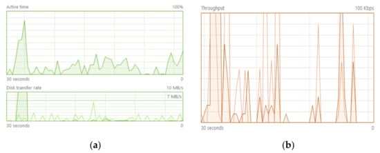 Figure 9a shows the data-allocation rate from receiver end to the processing edge while distributing the task by the cluster head for near-optimized video-data processing by the proposed cooperative-based learning approach. During the distribution, the active time was 38% of the total processing time. The read speed was 472 kb/sec from the mother edge, while the write speed to the surrogate edge was 91.0 kb/sec. The average response time after the overall processing was 11.6 ms.