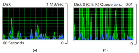 Figure 10a,b show disk utilization for a similar, but reverse, condition during the data allocation from the surrogate end to the mother edge in the presence of the cluster head for near-optimized decision making by the proposed cooperative-based learning approach. Figure 10b shows the repetitive collection of processed data from edges 1 to 6 at a 60 s duration. This procedure followed the cluster-mapping procedure, which is also called the data-allocation tree.
