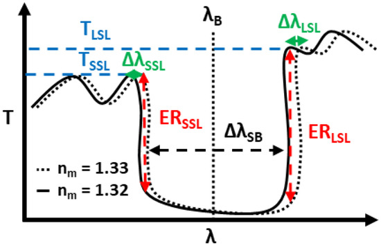 A typical BG transmission spectral behavior regarding sensing performance is shown in Figure 1, where the reflected spectral range is called the stopband (SB) and its central wavelength corresponds to the Bragg wavelength (λB) given as: