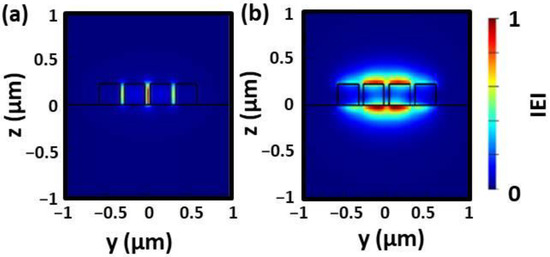 Before taking this approach, it is necessary to analyze the propagating modes in MS-WG. The simulated results of the optical intensities indicate that the mode confinement for the fundamental TE mode is in the slot regions and for the fundamental TM mode in the top and bottom regions of the WGs, as shown in Figure 2. From these results, it is evident that the fundamental TE mode is interacting more with the surrounding medium, and the TE modes will be used herein.