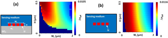Mapping Δneff for MS-WG as a function of height (H) and total width (Wt) with a slot size (Ws) of 60 nm shows that most effective sensor structures have a large WG height for the non-suspended WG, as seen in Figure 3a. While even H > 500 nm might increase the sensing effectiveness, it is easier to consider the usage of commercial chips with a standard WG height of H = 220 nm. As a second option, the suspended MS-WG was studied, as shown in Figure 3b. In this case the optimal structures for the higher sensitivities are for small MS-WG widths Wt of less than 500 nm regardless of WG heights. While smaller Wt values will provide higher sensitivity, the neff will also gradually decrease and in association increase the transmission loss (TL) due to possible increased scattering, affecting and decreasing the sensing peak sharpness. If the neff becomes smaller than nm it is categorized as a leaky mode.