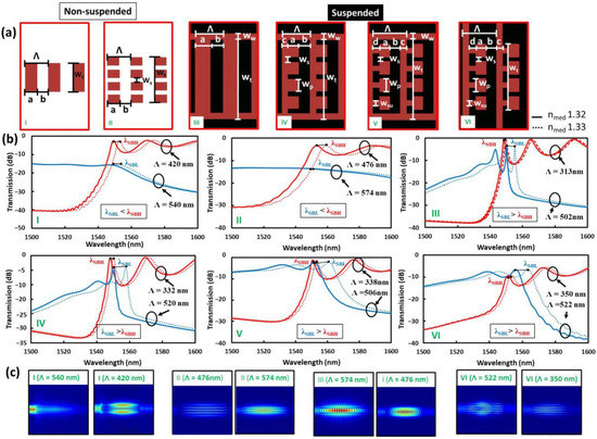 (a) Top views of the various BG RI sensors: I—SW BG, II—MS-SW BG, III- suspended ladder BG, IV– SAW BG, V—CSAW BG, and VI—CWIRE BG. (b) The respective transmission spectra with shorter (in blue) and longer (in red) wavelength-sides of the stopband at a fixed wavelength of 1550 nm fitted by Λ values. Parameters used are as follows: H = 220 nm (I, III–VI), 500 nm (II); Wt = 500 nm (I), 980 nm (II, VI), 600 nm (III), 1300 nm (III–V); Ws = 60 nm (II, IV-VI); Wsu = 60 nm (II, V, VI); Ww = 100 nm (III–V); d = 100 nm (IV–VI); c = 100 nm (V, VI); the duty ratios for all of the cases is 0.5. (c) E-field top views for the various BGs.