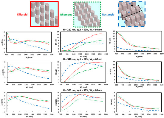 One can see that the rectangular pillar tends to exhibit higher sensitivities in Δλ and ER for narrower Wt and a larger WG height H than those of the other two pillar structures. This tendency seems to be the result of the lower material loss for the rectangular pillar, as shown in the TL characteristics of Figure 5. The optimal Wt is smaller for the rectangular pillar than that of the ellipsoidal and rhombus pillars and may be due to the larger volume ratio in the periodic unit volume, and this structural uniformity may reduce the loss. The reason why the larger H is better for the higher sensitivities may be due to the presence of more optical fields in the surrounding spaces between the pillars. Ellipsoidal and rhombus shapes may appear via deformation of the rectangular shape in the fabrication process. Depending on the fabrication issue, the optimal size conditions must be considered.