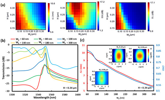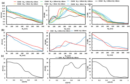 Next, the structural optimizations for the suspended structures such as SAW, CSAW, and CWIRE BGs were carried out. First, the sensing characteristics of CSAW BG with a constant H of 220 nm for various combinations with wall widths Ww from 40 nm to 100 nm and slot widths Ws from 60 nm to 100 nm as a function of pillar widths (Wp) were analyzed, as shown in Figure 6a. The wavelength sensitivities Δλ linearly decrease with an increase of Wp similar to the tendency for an increase of Wt shown in Figure 5. For the structures with narrower walls Ww and larger slot size Ws, the maximum Δλ of 11.7 nm was expected at the cost of low ER and large TL. The low ER is due to the sensing peak widening and high TL due to the low mode confinement. Further, the behavior of Δλ at small Wp seems to have higher values indicating that it corresponds to an optimal region. Optimal structures for higher ER seem to have two regions, in which the first is at a smaller peak at around Wp of 100 nm and the second at a more enhanced region at around Wp of 170 nm to 220 nm, depending on the corresponding modes and related stopband edges with their different steepnesses.