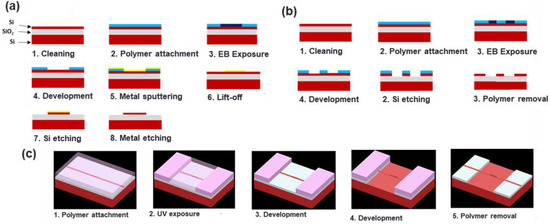 The Si MS-SW BG sensors were fabricated on SOI substrates with two major steps. The first step was the WG formation employing (1) electron beam lithography (EBL), electron beam deposition (EBD), and inductively coupled plasma reactive ion etching (ICP-RIE) or (2) EBL and ICP-RIE, corresponding to Figure 8a,b, respectively. The second step was to form the suspension structure, if necessary, by employing ultra-violet lithography (UVL) and wet etching of the SiO2 under-cladding buried oxide (BOX) layer corresponding to Figure 8c. The SOI wafers that were used had either 500 nm or 220 nm-thick silicon and 2 µm-thick BOX layers.