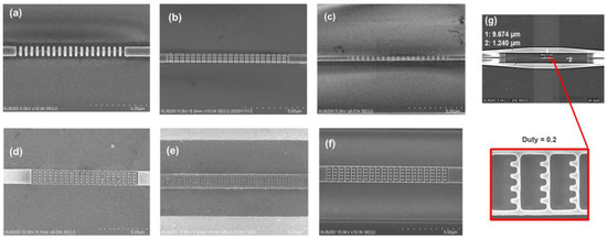 SEM images of fabricated BG RI sensors: (a) SW, (b) MS-SW, (c) suspended ladder, (d) CSAW formed by lift-off method, (e) CSAW formed by inverse exposure with not-fully etched or (f) with fully etched, and (g) SAW at duty of 0.2.