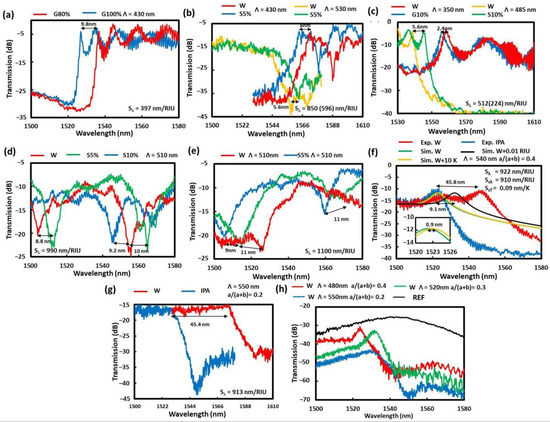 The measurement results are shown in Figure 10 for the various sensor structures as indicated. The structural sizes for (a) non-suspended SW BG were Wt = 500 nm, H = 220 nm, duty = 0.4, and Λ = 430 nm, and the wavelength sensitivity of Sλ = 397 nm/RIU was obtained with TL of 4.8 dB. Those for (b) MS-SW BG were: Wt = 780 nm, Ws = 75 nm, H = 500 nm, duty = 0.7, and Λ = 430 nm for LSL or Λ = 530 nm for SSL, obtaining an Sλ of 850 nm/RIU with TL of 5.5 dB and 591 nm/RIU with TL of 20 dB, respectively.